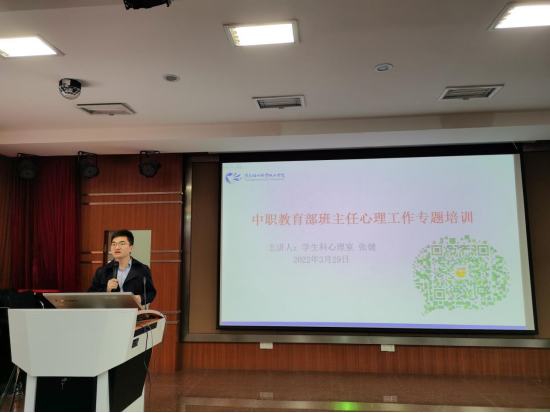 为进一步加强中职教育部学生心理健康教育工作,重点做好疫情防控形势下学生心理健康各项工作,3月29日下午中职教育部在学术报告厅开展了学生心理健康专题培训,中职教育部党总支书记罗维东、副主任杨育斌、学生科科长陈树华、各系副主任、学生管理人员及全体班主任参加了培训,培训由陈树华科长主持、张健老师主讲。
