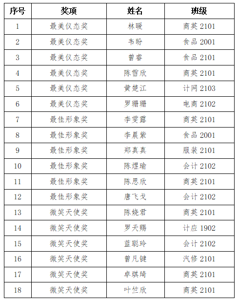 本次活动,同学们积极参加,并且表现优秀,给师生们留下了深刻的印象,林暖等同学获得了“最美仪态奖”,李雯露等同学获得了“最佳形象奖”,陈娆君等同学获得了“微笑天使奖”,具体获奖名单如下: