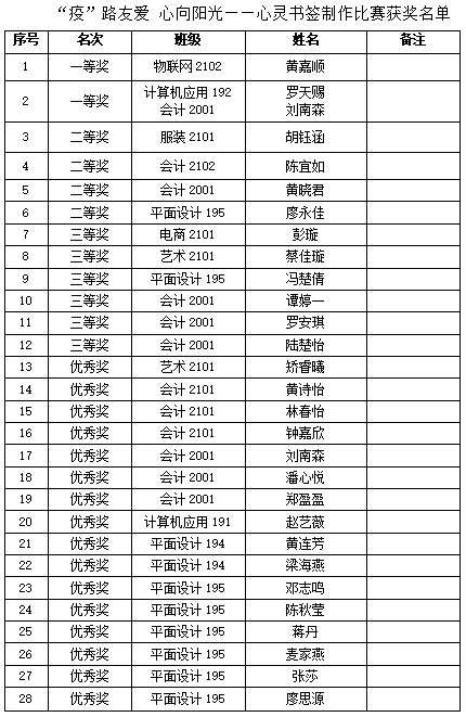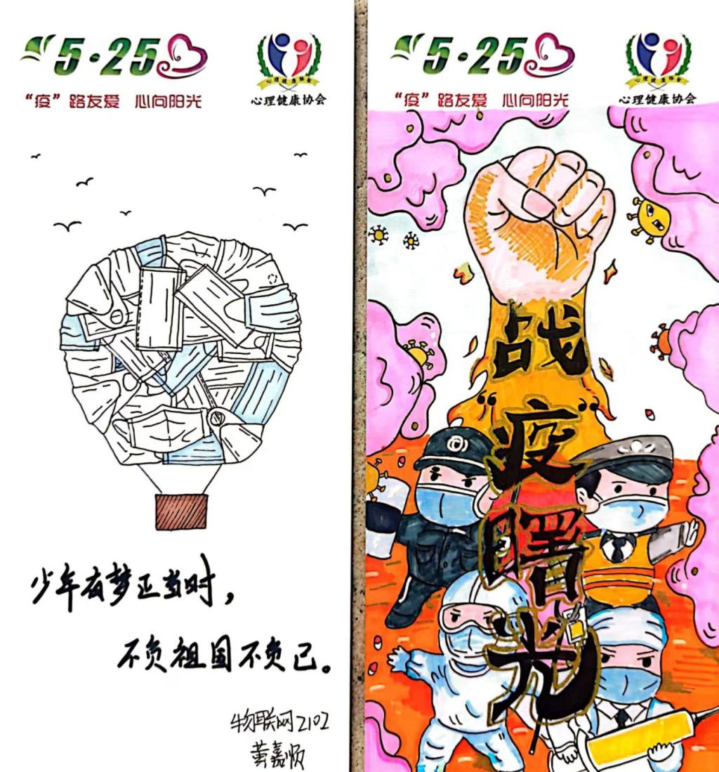 1.开展“心灵书签比赛”活动,向各班限量派送印有“5·25 ´疫´路友爱,心向阳光”的书签,同学们根据自己的心灵感受或者摘抄一些心灵语录进行书签设计。本次活动共收到学生作品49份,由伍肖瑜、张健、陈珂铭等老师担任评委,选出一等奖2名,二等奖4名,三等奖6名。(附获奖名单)