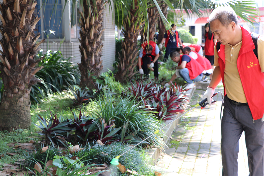 根据学校统一部署,为进一步加强绿色环保意识和生态意识,引导师生养成爱绿护绿、讲究卫生的文明行为,6月23日下午,行政第一党支部在琶洲校区开展“植绿护绿践初心,生态文明齐共建”主题党日活动,支部书记周成欣同志带领支部党员顶着烈日,杀虫、拔草。