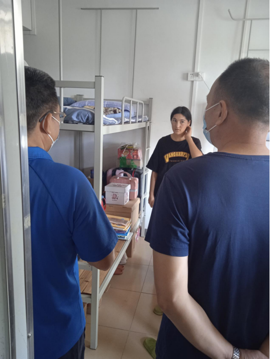上午10点左右,官春平副校长一行首先来到宿舍楼看望学生,关心学生疫情下的生活学习情况,并特别到新疆籍学生姑丽娜尔·阿迪那宿舍,关心了解她的近况,对学校饮食生活有什么需要帮助的地方,表扬她疫情下坚强执着的求学精神,勉励她要好好学习,中职毕业后能继续在广轻院深造。