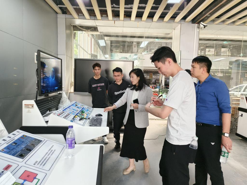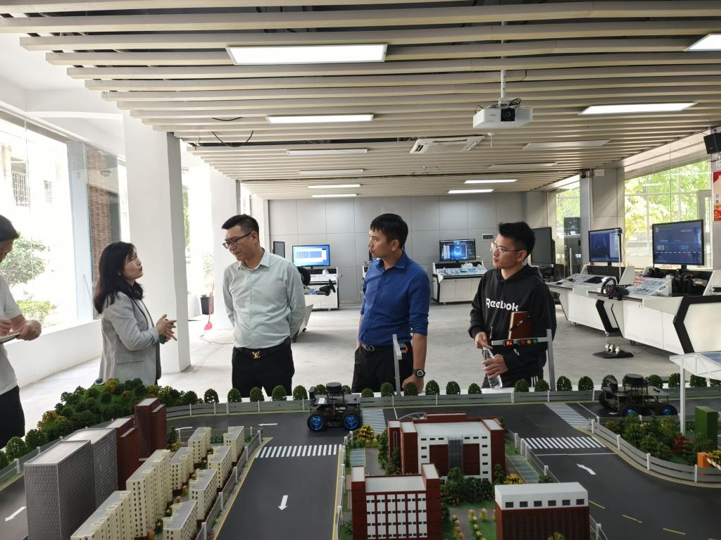 一行6人首先参观了我系汽车实训中心,重点参观智能网联汽车实训基地、新能源汽车实训室,参观后,电子商务技师学院针对实训建设理念,实训设备的使用情况,学生竞赛、老师教学等方面做深入了解,大家在交流学习中优势互补、资源共享,取得了较好的效果。