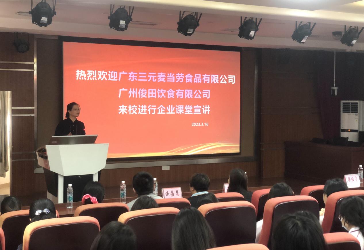为进一步提高教育教学质量,深化产教融合,3月16日下午,财经商贸系在二楼学术报告厅举行了企业进课堂宣讲活动。分别由广东三元麦当劳食品有限公司、广州俊田饮食有限公司相关负责人进行宣讲。21级食品专业、市场营销专业和商务英语专业的教研组长、班主任、全体同学参加了本次宣讲活动,活动由系主任黄丽主持。